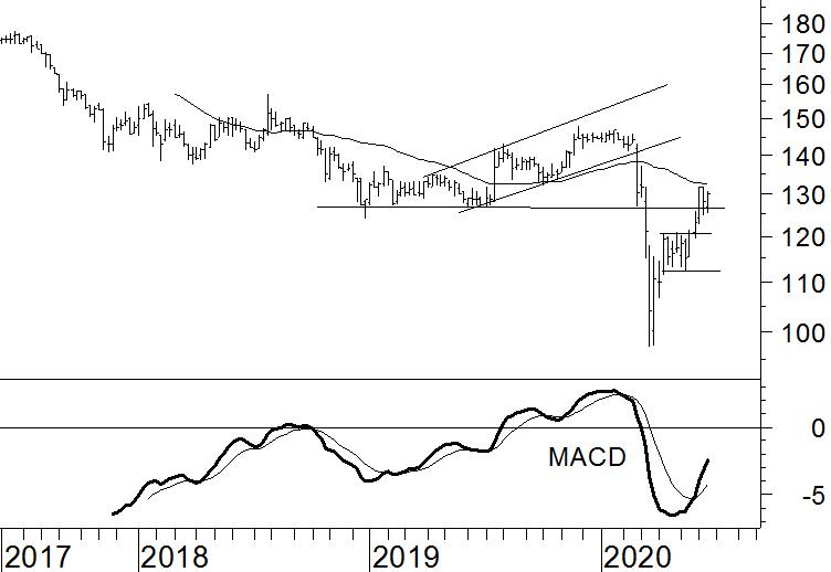 Ook HAL behoort tot het rijtje aandelen dat begin juni een adviesverhoging kreeg – van ‘verkopen’ naar ‘houden’ – maar niet behandeld kon worden. De koers brak toen uit een zijwaartse beweging, die weer ontstond na een herstelrally die zijn oorsprong vond in een zware oversoldconditie. Een opwaartse uitbraak uit een range die volgt op een herstelrally is vaak een voorbode van verder herstel. Dat bleek ook bij HAL het geval te zijn. De koers ondervindt de laatste paar weken echter weerstand van het 40-weeks voortschrijdende gemiddelde, zoals dat wel vaker gebeurt bij herstelrallies in een dalende primaire trend. De indicatoren staan verder ook negatief. Zo daalt de gemiddeldelijn nog altijd en bivakkeert de MACD onder nul, ondanks een mooi herstel en kruising tussen de MACD- en Triggerlijn. Het houdadvies blijft dan ook staan.