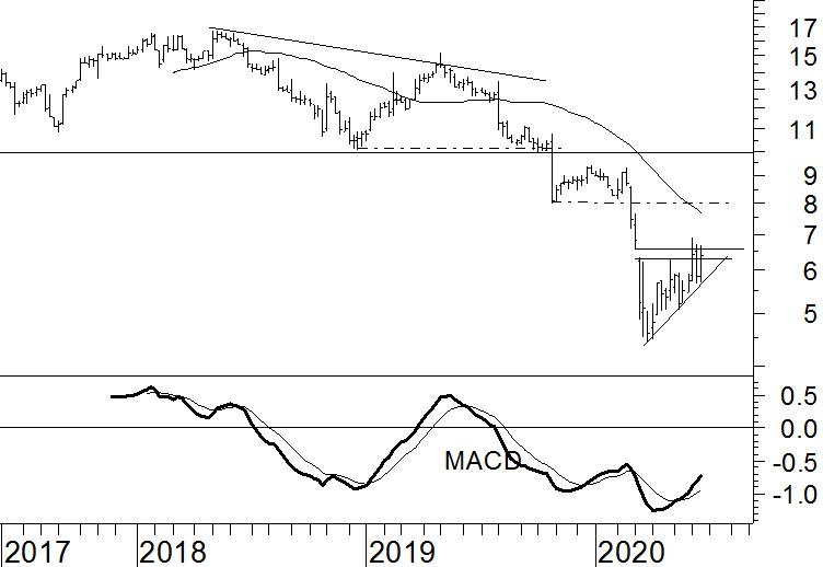 Ook Brunel kon begin juni niet worden behandeld toen de uitzender, tegelijk met diverse andere aandelen, van ‘verkopen’ naar ‘houden’ ging. Er waren toen twee redenen voor de adviesverhoging . Ten eerste dichtte de koers een gap, die werd gevormd aan het eind van de voorafgaande daling. De tweede reden betrof de opwaartse uitname van een oplopende driehoek, die mogelijk een bodempatroon zou kunnen worden. Het is echter nog te vroeg om van een definitieve bodem te spreken. Ten eerste is er nog bepaald geen sprake van een patroon van hogere toppen en bodems. Bovendien is ook (de weerstand) van de oude gap nog niet overtuigend doorgebroken. Tot slot staan ook de indicatoren nog niet positief. Zo daalt het 40-weeks voortschrijdende gemiddelde nog altijd en staat de MACD onder nul. Het aandeel blijft op ‘houden’ staan.
