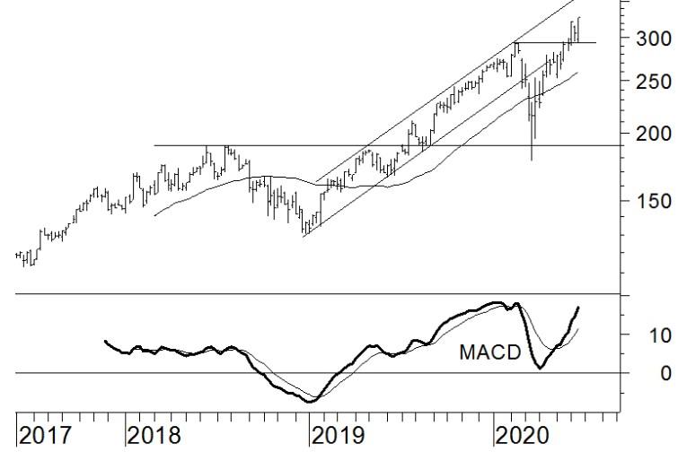 ASML staat sinds begin juni op ‘kopen’. Het aandeel kon toen niet worden behandeld omdat er in die week veel aandelen van de shortlist naar ‘houden’ gingen (of van ‘houden’ naar ‘kopen’). Het was jammer dat het aandeel enkele maanden ervoor op ‘houden’ was gezet. We konden toen echter niet anders omdat de koers uit een stijgend trendkanaal en door het 40-weeks voortschrijdende gemiddelde was gezakt. De richting van dit gemiddelde geeft altijd een goede indicatie van de langetermijntrend, en biedt ook steun bij neerwaartse correcties in een opgaande trend (of weerstand bij opwaartse correcties in een dalende trend). Als het gemiddelde dan geen steun (of weerstand) biedt, is het altijd raadzaam even een pas op de plaats te maken. Dat was het geval bij ASML. De nieuwe all-time high was overigens begin juni de reden het aandeel weer op ‘kopen’ te zetten.