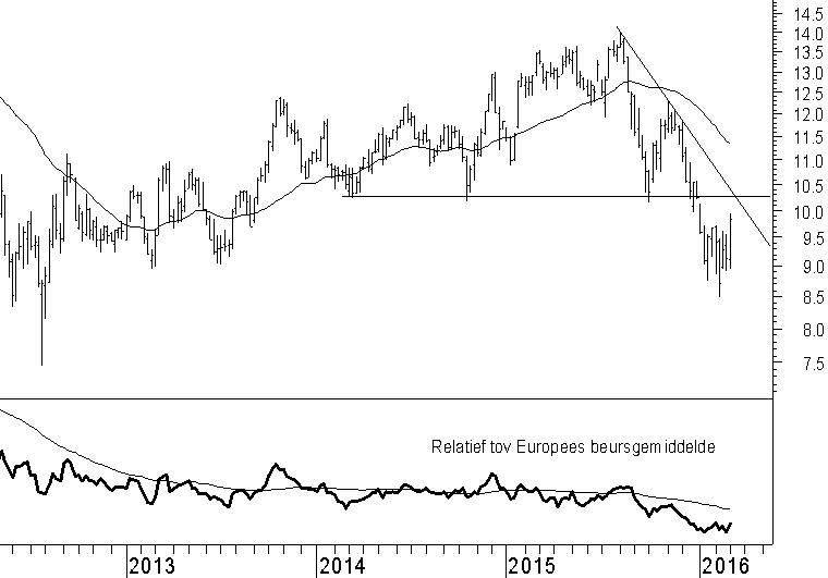 Telefónica kent een negatief technisch beeld. Dat werd vooral duidelijk nadat het aandeel eind december onder het steunniveau rond €10,25 was gezakt. Inmiddels is de dalende trend goed gevestigd in de weekgrafiek. Onder andere blijkt dat uit het patroon van lagere toppen en bodems maar ook uit het sterk neerwaarts gerichte 40-weeks gemiddelde. Tijdens de zwakke start van het beursjaar 2016 heeft Telefónica het koersdoel op €9 bereikt. Daarmee is in ieder geval voldaan aan de eerste doelstelling van het verkoopadvies. Op dit moment is sprake van een herstelbeweging met als maximaal potentieel het oude steunniveau rond €10,25, dat nu dienst doet als weerstand.