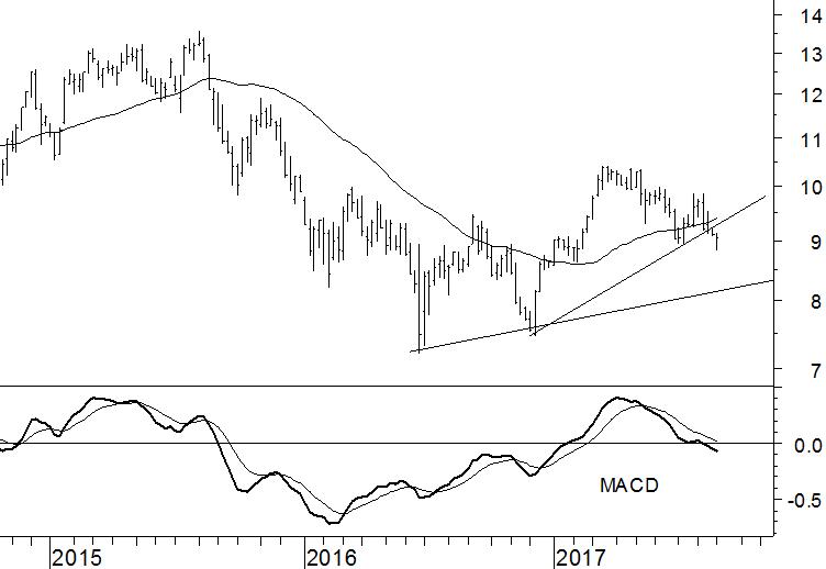 Telefónica kende een ijzersterke start van 2017. Alles wees erop dat het aandeel ook de rest van dit jaar kon profiteren van een positief technisch beeld. In de afgelopen maanden is dat beeld langzaam maar zeker aangetast. Het definitieve einde van de stijgende trend kwam onlangs met de val onder €9,50 en daarmee onder de oplopende steunlijn. Helaas is hierdoor ook de MACD-indicator onder de nullijn terechtgekomen.