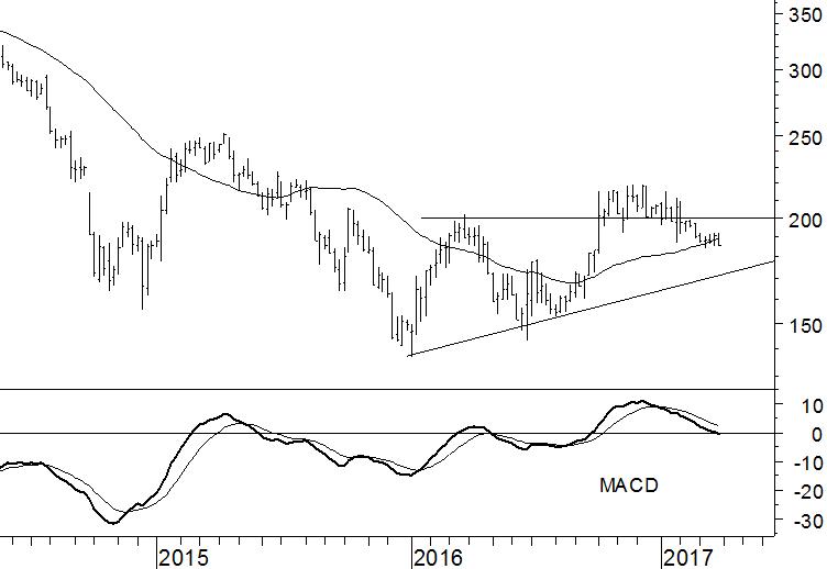 In oktober leek het erop dat de doorbraak boven 200p voor Tesco de start inluidde van een nieuwe stijgende trend. Dat stemde ons optimistisch, maar vooralsnog stelt Tesco teleur. Niet alleen is het aandeel teruggezakt onder het 200p-niveau, ook het 40-weeks gemiddelde staat onder druk. Tel daarbij de terugval van de MACD-indicator onder de nullijn en de verzwakking van het technische beeld is een feit. Voorlopig zien we het niet gebeuren dat Tesco de weg omhoog spoedig terugvindt. Eerder groeit de kans op een meer zijwaartse koersbeweging met 170p als eerste steunniveau in de vorm van de stijgende trendlijn. Aan de bovenkant is 200p opnieuw een weerstand met 220p als ultieme bovengrens. Gelet op de verzwakking van het technische beeld is een adviesverlaging naar ‘houden’ onvermijdelijk.