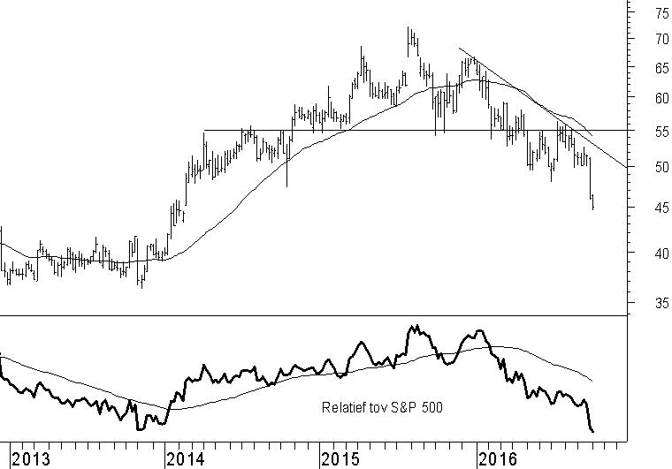 Een eventueel herstel zal weerstand ondervinden rond $53, het niveau van de dalende weerstandslijn. Komt er een herstel, dan biedt dit een goede gelegenheid om het aandeel alsnog te verkopen. Ook vergeleken met het brede Amerikaanse beursklimaat is het technische beeld somber. De onderliggende relatievesterktelijn laat dat zien. Er is geen alternatief voor het bestaande verkoopadvies.
