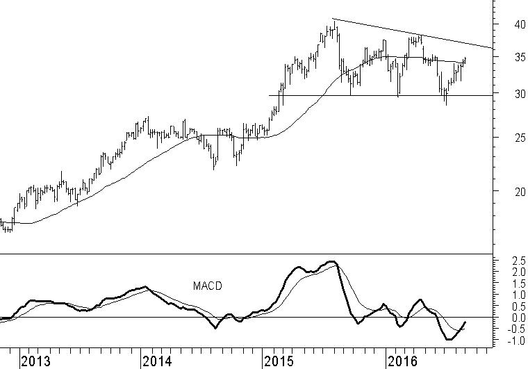 TKH bevindt zich op dit moment in niemandsland. Zowel aan de boven- als de onderkant weerhoudt een duidelijke grens het aandeel van een trendmatige beweging. In de weekgrafiek is duidelijk te zien dat de ondergrens wordt gemarkeerd door het steunniveau rond €30. Al meerdere keren in het laatste jaar hebben beleggers dit koersniveau aangegrepen om aandelen TKH te kopen. Dit collectieve beleggersgedrag schept steun- en weerstandsniveau’s. Na een opleving vanaf het €30-niveau is het aandeel onlangs boven de gemiddeldelijn gebroken. Hierdoor ontstaat enig opwaarts potentieel. Echter, dit potentieel is beperkt tot het niveau van de dalende weerstandslijn, dat momenteel uitkomt rond €37. Voorlopig zien wij dan ook geen koerstrend die voor langere tijd kan aanhouden.