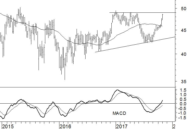 Total laat een interessante verbetering zien. Toch blijft het technische beeld neutraal zolang de barrière rond €49 niet wordt overwonnen. Positief is wel dat het aandeel is teruggekeerd boven het 40-weeks gemiddelde. Ook de MACD-indicator is weer boven water nu de nullijn in positieve richting is gepasseerd. Wat ons weerhoudt van een adviesverhoging is de barrière rond €49. In de weekgrafiek is te zien dat Total ook aan het begin van dit kalenderjaar stuk is gelopen op dit koersniveau.