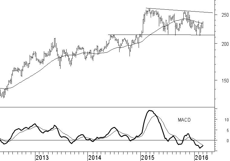 Unibail-Rodamco kent al langere tijd een neutraal trendbeeld. Al meer dan een jaar wordt de onderkant daarvan begrensd door het steunniveau rond €205. De bovenkant wordt bepaald door de dalende weerstandslijn die momenteel uitkomt rond €255. Op dit moment beweegt de koers van Unibail-Rodamco zich in het midden van de genoemde bandbreedte en is er sprake van een evenwicht tussen vraag en aanbod. Omdat enkele weken terug het aandeel is opgeveerd vanaf het steunniveau rond 205 is het voor de komende weken het meest waarschijnlijk dat nu de bovenkant van de bandbreedte aan een test zal worden onderworpen. Dat opent een beperkt opwaarts potentieel. Groot wordt het opwaarts potentieel pas als Unibail-Rodamco uitstijgt boven het hoogtepunt van 2015 op €262. In dat geval zal een nieuwe stijgende trend van start gaan. Tot die tijd voelen wij ons comfortabel bij het bestaande houdadvies; we komen pas in actie wanneer een van beide grenzen van de bandbreedte wordt doorbroken.