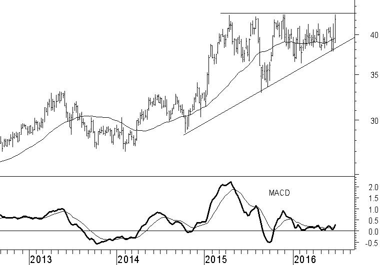 Unilever kent ook al langer een technisch beeld dat als neutraal te classificeren valt. In de weekgrafiek is te zien dat ruim een jaar geleden de beurskoers rond hetzelfde niveau bewoog. Toch is de onderliggende tendens positief. Dat komt door de aanwezigheid van hogere koersbodems, die aangeeft dat de draai naar een sterkere vraag naar het aandeel steeds op een hoger niveau plaatsvindt. Enkele weken terug veerde Unilever goed op vanaf het onderliggende steunniveau rond €38, dat wordt bepaald door de stijgende steunlijn. Het positieve sentiment heeft Unilever naar de weerstand rond €43 getild. En dat is een zware weerstand; ook in 2015 is dit niveau enkele keren een te grote barrière geweest. Uiteindelijk verwachten wij dat de koopinteresse sterk genoeg is om de weerstand rond €43 te breken, maar of dat direct bij deze poging lukt is onzeker. Vandaar dat wij veiligheidshalve het bestaande houdadvies handhaven totdat de daadwerkelijke doorbraak zichtbaar wordt.