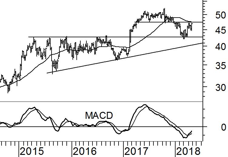 Wij verlaagden ons koopadvies eind vorig jaar naar een houdadvies, nadat het aandeel door de steunzone rond €47,50 was gebroken. Nu, vier maanden later, staat Unilever weer op hetzelfde koersniveau. In de tussentijd testte het aandeel het steunniveau nabij €42, dat wordt gevormd door een reeks toppen uit 2015 en 2016. Deze steun wist zich te handhaven en het belang ervan is daardoor fors toegenomen.