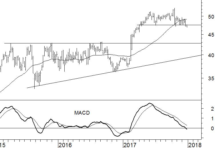 Unilever heeft het grootste deel van 2017 doorgebracht in een zijwaartse beweging. Telkens was daarbij het €47,50-niveau de ondergrens waar nieuwe koopinteresse in het aandeel zichtbaar werd. In de laatste beursweek van vorig jaar is dit koersniveau gesneuveld. Maar dat is niet het enige probleem voor Unilever. Het technische beeld is verder verzwakt doordat de MACD-indicator onder de nullijn is terechtgekomen. Bovendien heeft het 40-weeks gemiddelde een meer zijwaarts karakter gekregen.