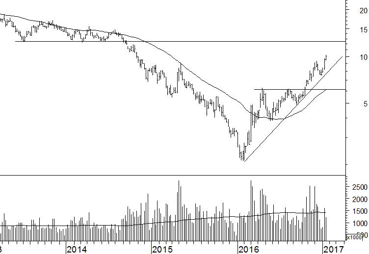 Vale (VALE) bevindt zich al meer dan een half jaar in een stijgende trend. Vooral nadat in oktober de weerstand rond $6 werd gebroken is het snel gegaan. Inmiddels is het koersdoel op $9 overtroffen door de meest recente opwaartse impuls. Het technische beeld oogt gezond. Een patroon van hogere toppen en bodems met een oplopende gemiddeldelijn is een indicatie dat de stijgende trend nog een verdere weg te gaan heeft.