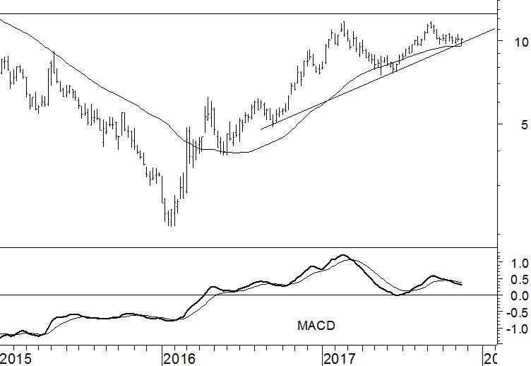 Met $9,50 als belangrijk vangnet is het aandeel klaar voor een opleving. Het $9,50-niveau wordt bepaald door de combinatie van het 40-weeks gemiddelde en de stijgende steunlijn. Het wachten is derhalve op nieuwe koopinteresse en een opmars naar de belangrijke weerstand rond $12,50. Dit positieve scenario valt in het water wanneer het $9,50-niveau toch geen stand weet te houden. In dat geval sneuvelt de stijgende trend. Voorlopig is daarvan geen sprake en handhaven wij het koopadvies.