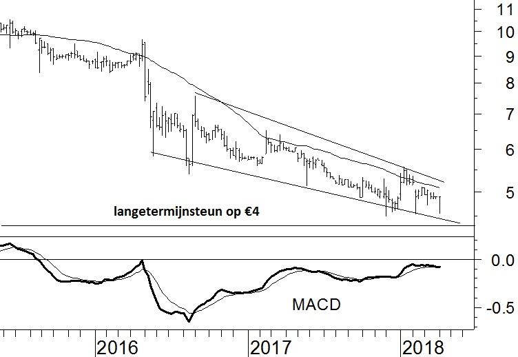 Maar allemaal erg duidelijk zijn de technische patronen niet. Kortom, er is geen technische analyse volgens het boekje mogelijk. Belangrijk is wel dat er steun ligt op €4,00/4,20. In het verleden vond de koers van Value8 daar meerdere malen houvast.