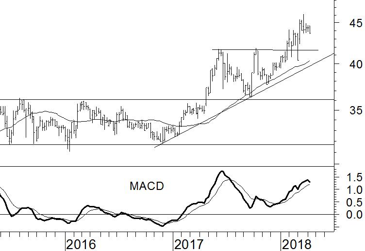 Sligro is een van de beter presterende aandelen van Euronext en er is vooralsnog geen enkele reden om ons koopadvies aan te passen. Wij gaven het aandeel een kooptip toen de koers april vorig jaar door de horizontale weerstand op €36 was gebroken. Na een verdere stijging zakte de koers medio 2017 weer terug naar de bovenkant van de zijwaartse bandbreedte. Dit wordt ook wel een pullback genoemd.
