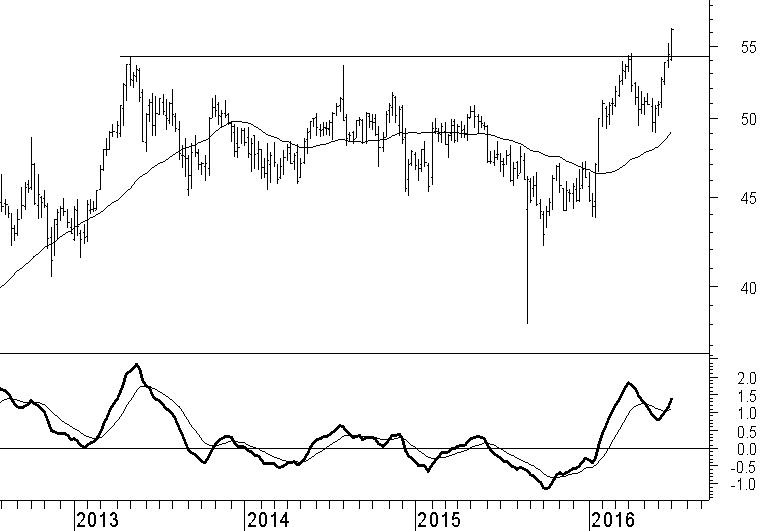 Verizon Communications (VZ) laat een positief technisch beeld zien. Op indrukwekkende wijze breekt het aandeel door de $55-grens. Zowel in 2013 als eerder dit jaar bleek rond dit niveau flinke verkoopdruk aanwezig. De koerstoppen die daarbij zijn gevormd, zijn een aanwijzing dat de oorspronkelijke vraag naar het aandeel is omgeslagen naar een sterker aanbod aan aandelen. Met dat aanbod is nu afgerekend en het aandeel heeft voldoende ruimte voor een verdere koersstijging. In de komende weken verwachten wij dat de nieuwe stijgende trend verder wordt uitgebouwd. Een eerste richtpunt daarbij is het hoogtepunt uit 1999 op $59. Als ook deze barrière is overwonnen staat Verizon Communications niets meer in de weg om records te breken. Het aandeel verdient zeker een plaats in de Amerikaanse aandelenportefeuille. Wij verhogen het advies naar kopen.