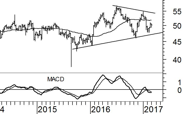 Bij Verizon (VZ) is een symmetrische driehoeksformatie zichtbaar. Dit koerspatroon wordt gekenmerkt door een opeenvolging van hogere bodems en lagere toppen. De dalende weerstandslijn en de stijgende steunlijn zullen elkaar dus uiteindelijk kruisen. Gewoonlijk komt een dergelijk patroon op ongeveer twee derde van de ‘levensduur’ tot een ontknoping door een op- dan wel neerwaartse doorbraak.