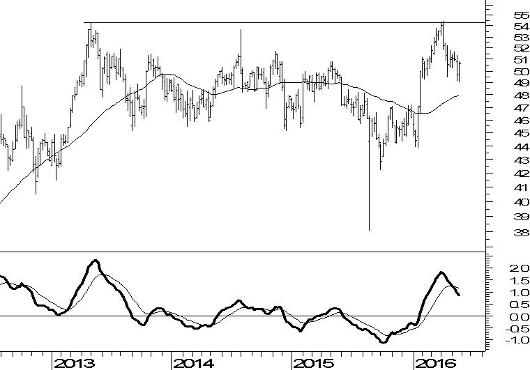 Verizon (VZ) heeft een fantastische start van dit kalenderjaar gekend. De laatste maanden is echter de klad gekomen in het koersverloop. Kijkend naar de weekgrafiek is dat niet vreemd. Rond $54 bevindt zich een sterk weerstandsniveau dat ook in 2013 zorgde voor een einde van de opmars van destijds. De terugval vanaf het weerstandsniveau brengt het aandeel in niemandsland. Onderliggend voorziet het 40-weeks gemiddelde nog in een steunniveau rond $48. Vandaar dat tussen $48 en $54 het technische beeld neutraal is. De onderliggende MACD-indicator is recent negatief gekruist en dat wijst wel op enig negatief momentum.