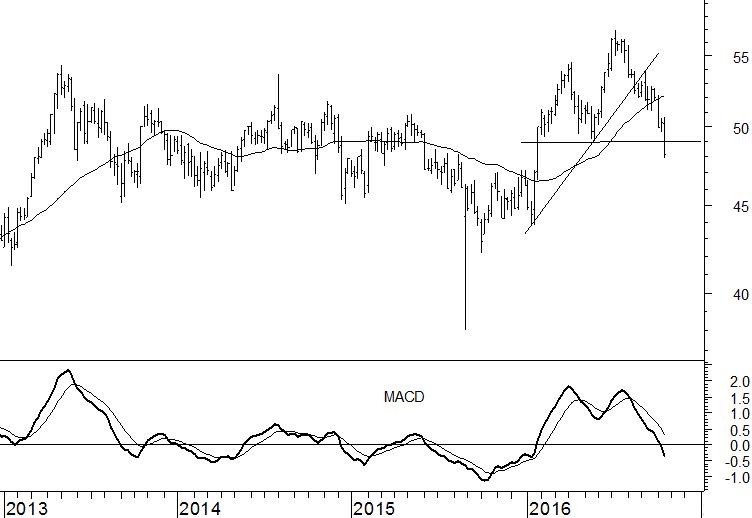 Vaak is er een overgangsperiode tussen de stijgende en de zijwaartse trend, maar dit keer ontbreekt deze volledig. Opeenvolgend is de stijgende steunlijn, het 40-weeks gemiddelde en het steunniveau rond $49 gebroken. Inmiddels valt ook de MACD-indicator terug onder de nullijn. De snelheid van de verslechtering heeft ons verrast.