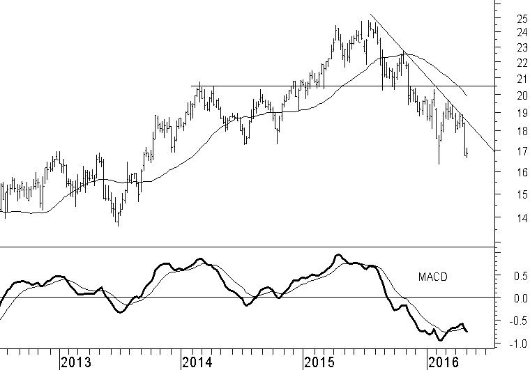 Vivendi liet afgelopen november een belangrijke verzwakking zien van het technische beeld toen het aandeel onder het steunniveau rond €20,50 terechtkwam. Dat was de officiële start van het patroon van lagere toppen en bodems. Zoals te zien in de weekgrafiek is dit patroon nog tot op de dag van vandaag ongeschonden. Sterker nog, recent heeft Vivendi op basis van een weekslotkoers een nieuw dieptepunt bereikt binnen de dalende trend. Tegelijkertijd is daarmee het koersdoel op €17,50 bereikt en overtroffen. Vooralsnog verwachten wij niet dat de verkoopdruk een halt zal worden toegeroepen. Ook de onderliggende MACD-indicator kruist weer in neerwaartse richting.