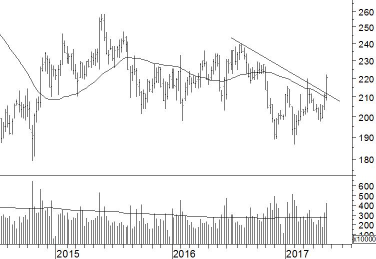 Vodafone doet het beter dan verwacht. Tot recent hadden wij ingezet op een verdere daling van het aandeel in lijn met het neerwaartse verloop van het 40-weeks gemiddelde. Hoopgevend is het feit dat beleggers de weg naar Vodafone hebben teruggevonden en het aandeel boven de weerstand rond 210p hebben getild. Zowel de genoemde gemiddeldelijn als de dalende weerstandslijn kwam hier samen. De koopinteresse ten tijde van de doorbraak was sterk, zoals blijkt uit de bovengemiddelde beursomzetten.
