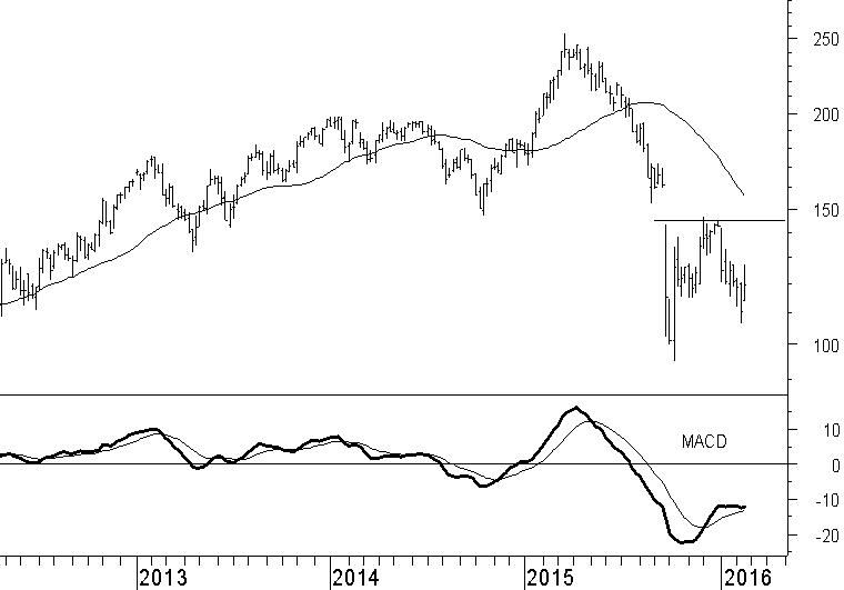Volkswagen maakt sinds de openbaring van het sjoemelsoftwareschandaal een roerige tijd door. Dat vindt zijn weerslag in de weekgrafiek van het aandeel. De grootste klap kreeg Volkswagen in de weken na de eerste krantenkoppen. Sindsdien valt de schade aan het koersverloop best mee. Daarom kan gesteld worden dat de kracht van de dalende trend aan het afnemen is. Verkopers zijn ook niet meer in staat om de koers van het aandeel onder het dieptepunt van 2015 te drukken. Dat de dalende trend een adempauze neemt blijkt ook uit de positieve kruising van de MACD-indicator. Echter, Volkswagen is nog ver verwijderd van een tastbare verbetering van het technische beeld. Daarvoor is het nodig dat de weerstand rond €145 krachtig wordt doorbroken, het liefst in combinatie met een doorbraak boven het 40-weeks gemiddelde. Voorlopig mogen wij de dalende trend nog niet afschrijven.