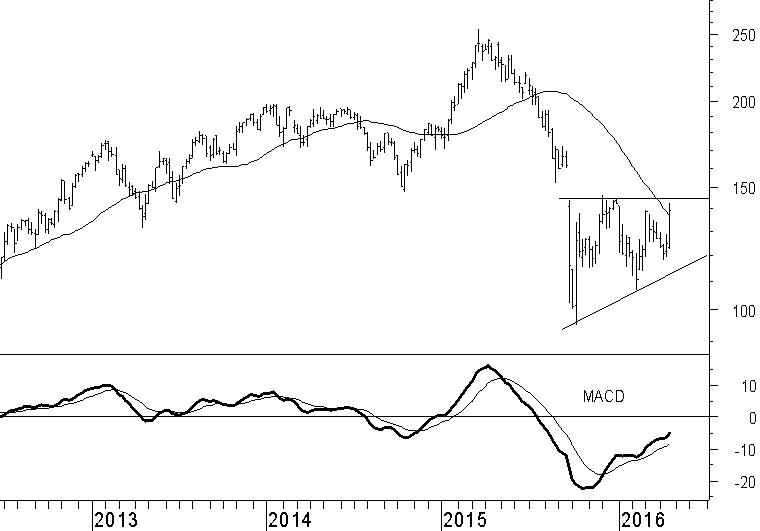 Volkswagen lijkt weer in rustiger vaarwater te komen. In ieder geval is in de weekgrafiek te zien dat de belangrijkste koersbodems van de laatste maanden telkens op een hoger niveau worden geplaatst. Dat wijst op een afnemende koersdruk. Nog wel is het onmiskenbaar dat het 40-weeks gemiddelde een sterk neerwaarts gericht verloop kent, en deze objectieve trendmeter vormt een belangrijke input voor onze analyse. Tegelijkertijd staat Volkswagen op het punt om deze trendmeter te doorbreken. Dat zou positief zijn. Maar belangrijker nog is de weerstand rond €145. Daar vormen enkele oude koerstoppen samen een stevig koersplafond dat het opwaartse potentieel beperkt. Het technische beeld van Volkswagen wordt derhalve gevangen gehouden tussen enkele positieve en negatieve krachten. Het advies wordt verhoogd naar ‘houden’.