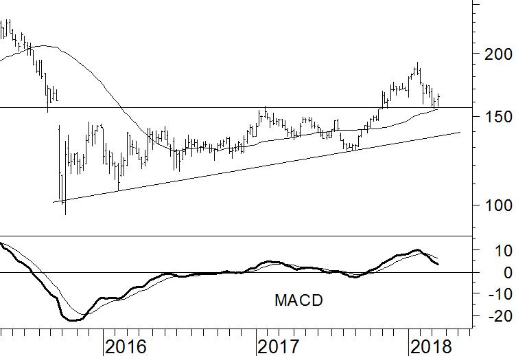 Er is nu sprake van dubbele steun, want ook het oplopend 40-weeks gemiddelde ligt net onder de trendlijn. Als het aandeel hier inderdaad met succes steun vindt, en daar lijkt het sterk op, kan de koers verder omhoog. Als we de oude driehoeksformatie omklappen (pendulum-swingmethode), dan ontstaat een koersdoel van €210.