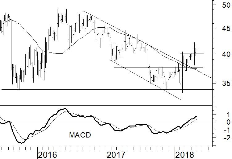 Geleidelijk werd het technische beeld minder negatief. De koers wist bij herhaling steun te vinden rond €34. Daarna ontstond er net als bij BAM een positieve divergentie tussen de koers en de MACD: de koersbodems kwamen steeds lager terecht, maar de indicator krulde omhoog. Begin 2018 brak het aandeel uit het dalend trendkanaal. Vervolgens ontstond een zijwaartse beweging, maar ook hier is de koers recent uitgebroken door de weerstand op €40 uit te nemen. Het eerste koersdoel ligt op €45, op het niveau van de toppen van begin 2017.