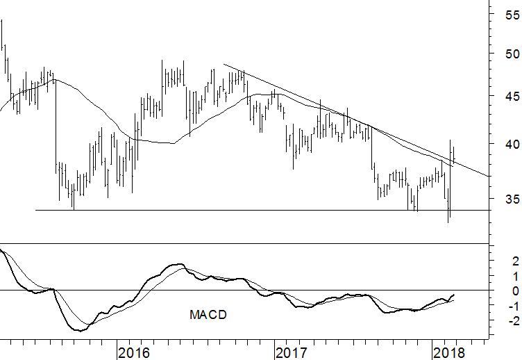 Vopak sluit een moeilijk jaar af en ging ook in 2018 slecht van start. Begin februari noteerde het aandeel zelfs kortstondig op het laagste niveau in meer dan drie jaar. Gelukkig hield het steunniveau rond €34 een definitieve breuk tegen. De laatste weken is sprake van een krachtige opleving. Voor het eerst in meer dan een jaar kwam het aandeel op basis van een weekslotkoers boven het 40-weeks gemiddelde terecht. Ook de dalende weerstandslijn is gebroken.