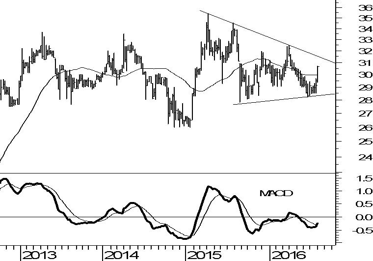 Vanzelfsprekend zou dat een vers koopadvies met zich meebrengen. Maar zover is het echter nog niet. Wanneer de weerstand rond €31 zijn werk doet, dan zet de huidige zijwaartse beweging zich voort met €28,50 als ondergrens. Daar zorgt de steunlijn voor een goed vangnet onder de beurskoers.