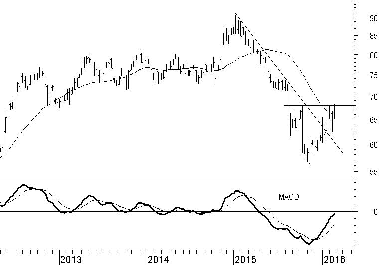Wal-Mart heeft het moeilijk gehad in het afgelopen jaar. Vanaf een koersniveau rond $90 is het aandeel in een tijdsbestek van elf maanden weggezakt tot $57 in november vorig jaar. Een duidelijke dalende trend waarvan trendvolgende beleggers goed hebben kunnen profiteren. Toch lijkt het erop alsof deze dalende trend haar beste tijd heeft gehad. Een eerste aanwijzing daarvoor kwam enkele weken geleden toen Wal-Mart boven de dalende weerstandslijn brak. Belangrijker nog is dat het aandeel nu probeert terug te komen tot boven het 40-weeks gemiddelde. Zeker in combinatie met de positieve ontwikkeling in de MACD-indicator is het onmiddellijke neerwaartse risico geweken.