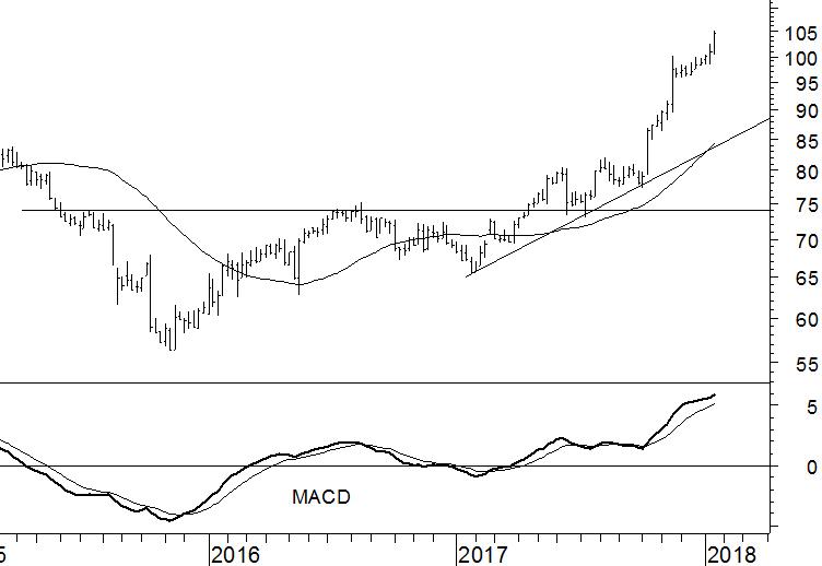 Wal-Mart (WMT) brak in april vorig jaar boven de weerstand rond $74 uit, wat tevens de start betekende van de huidige stijgende trend. Deze trend heeft de laatste maanden een krachtig vervolg gekregen, waarbij het psychologische $100-niveau werd overtroffen. Niets wijst erop dat het aandeel spoedig onder koersdruk komt te staan. Wel is de stijgende trend overstrekt, maar een dergelijke conditie kan lang aanhouden.