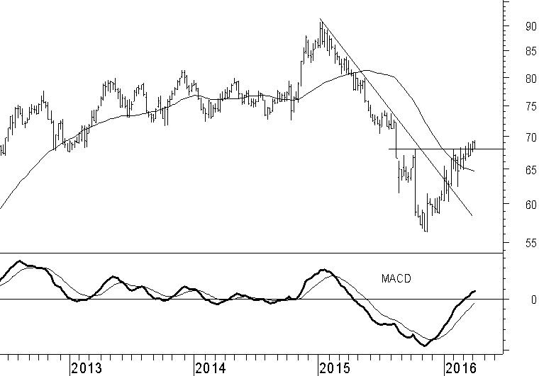 Wal-Mart (WMT) kent een goed begin van 2016. Eerder dit jaar werd al korte metten gemaakt met de dalende trend die in 2015 een groot deel van de beurswaarde van Wal-Mart heeft laten verdampen. De laatste weken knapt het technische beeld verder op. Niet alleen is het aandeel boven het 40-weeks gemiddelde gebroken maar ook de weerstand rond $67 lijkt te sneuvelen. Overtuigend is de doorbraak nog niet, maar wij hebben vertrouwen in een verdere opmars van het aandeel in de komende maanden. Dit vertrouwen wordt ondersteund door de MACD-indicator, die weer terug is boven de nullijn. Dat geeft aan dat het momentum opwaarts is gericht.