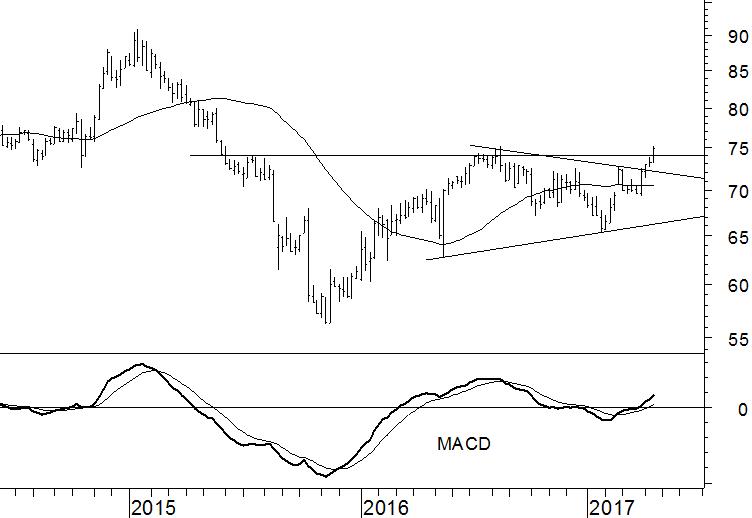 Met de recente doorbraak aan de bovenkant komt er verandering in de status quo tussen vraag en aanbod. Vooral de doorbraak boven de weerstand rond $74 maakt indruk. Dit geeft aan dat er sprake is van flinke koopinteresse; het $74-niveau zorgde in 2015 en 2016 juist nog voor verkoopdruk.