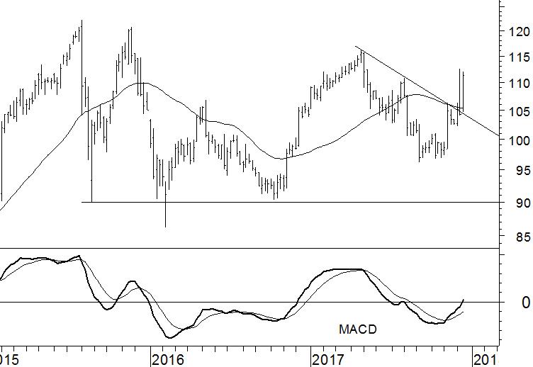 Nu krabbelt het aandeel weer op. Als wapenfeit noteren wij de recente terugkeer boven het 40-weeks gemiddelde. Tegelijkertijd is de weerstandslijn rond $105 gebroken.