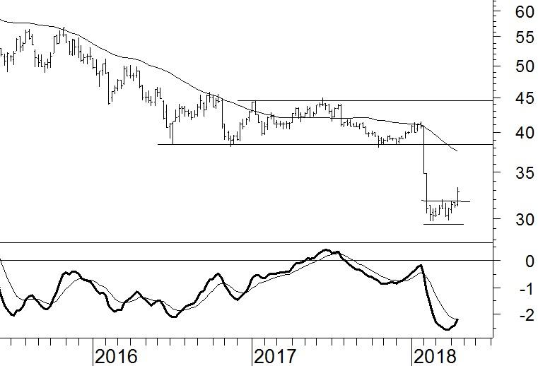 Maar recent is het aandeel uitgebroken, en daarom achten we het verkoopsignaal niet langer gerechtvaardigd. De MACD-indicator krult ook opwaarts en maakt aanstalten om de signaallijn te doorbreken. Het 40-weeks voortschrijdende gemiddelde is nog wel dalend. Een koopsignaal is daarom nog niet op zijn plaats, maar het aandeel verdient nu zeker een houdadvies.