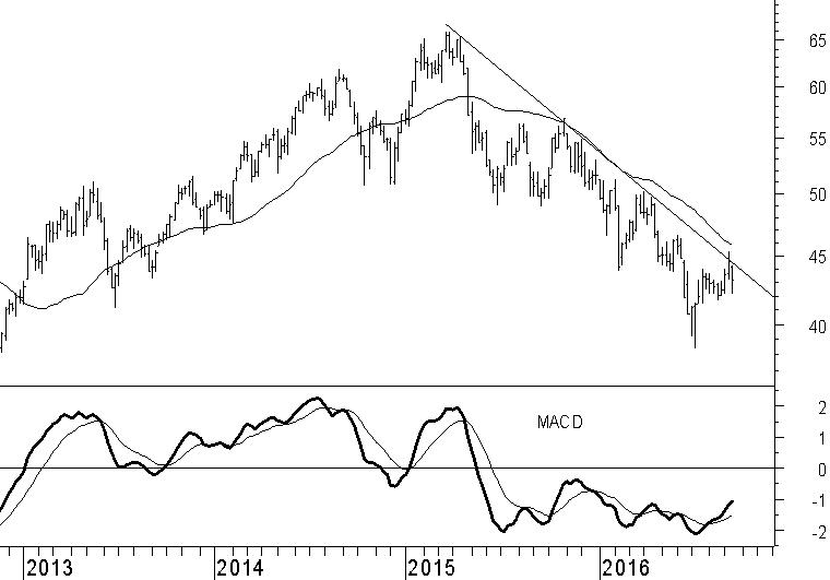 Wereldhave ziet nog geen licht aan het einde van de tunnel. Al sinds maart 2015 staat het aandeel onder flinke koersdruk. Duidelijke indicatoren dat de trend omlaag is gericht zijn het patroon van lagere toppen en bodems en het neerwaarts bewegend 40-weeks gemiddelde. Voorlopig zijn deze twee belangrijke voorwaarden voor de dalende trend onverminderd van toepassing.